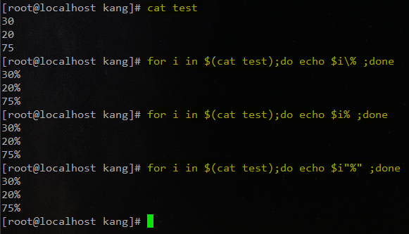 = 공백을 기준으로 출력되는 각각의 문자 뒤에 "%" 삽입