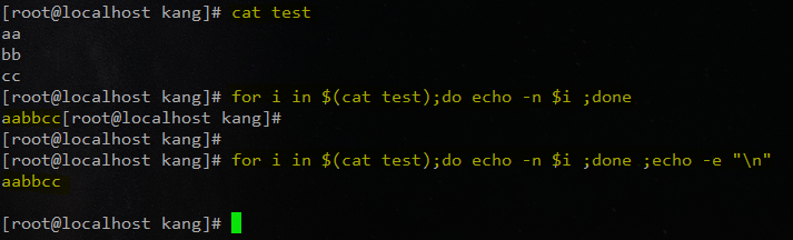 = test 파일의 내용을 공백을 기준으로 하나씩 출력하고 개행을 제거합니다.